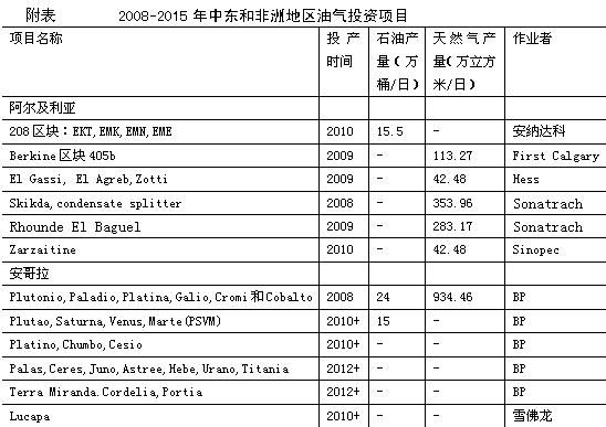 中東和非洲地區(qū)擁有豐富的油氣資源和巨大的開發(fā)能力,是全球最重要的能源供應(yīng)中心。2007年中東和非洲地區(qū)探明石油儲量8631億桶,占世界的64.8%,產(chǎn)量3549萬桶/日,占世界的43.3%,消費量915.8萬桶/日,占世界10.7%,天然氣儲量86.04萬億立方米,占世界的49.1%,產(chǎn)量5462億立方米(年),占世界的18.6%,消費量3829億立方米(年),占世界的13%。近年來,由于國際市場能源產(chǎn)品價格持續(xù)高位震蕩所帶來的較高投資回報率,以及天然氣能源的節(jié)能環(huán)保、開采成本優(yōu)勢,中東和非洲一些能源生產(chǎn)國紛紛計劃擴大在能源領(lǐng)域的投資,加大油氣資源開發(fā)力度,促進本國能源產(chǎn)業(yè)多元化發(fā)展。2008~2015年,即將有101個油氣項目投入生產(chǎn),其中包括一些世界級油氣田的新開發(fā)和老油氣田的二次開發(fā)(附表),預(yù)計石油高峰產(chǎn)量可增加1382.3萬桶/日,天然氣高峰產(chǎn)量可增加50724.29萬立方米/日。中東將繼續(xù)保持世界第一大原油供給中心的地位,非洲也將成為非歐佩克原油供應(yīng)增長的主要來源和全球增長速度最快的石油市場之一。