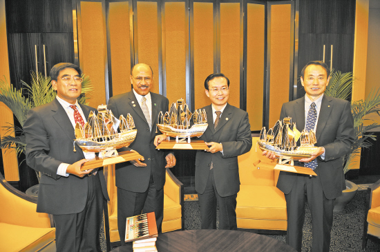 11月7日,中國(guó)石化集團(tuán)公司總經(jīng)理蘇樹(shù)林(右二)、中國(guó)石油天然氣集團(tuán)公司總經(jīng)理蔣潔敏(右一)、中國(guó)