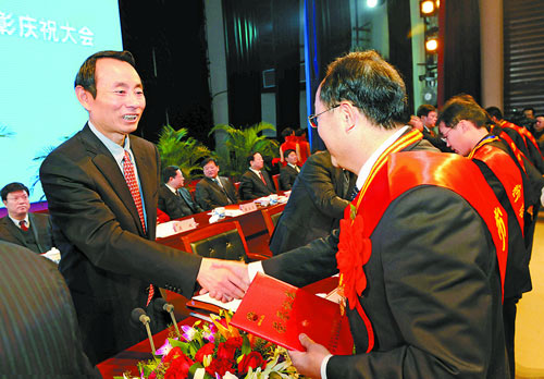 集團(tuán)公司總經(jīng)理蔣潔敏為長慶油田勞模代表和“感動長慶”典型代表頒獎。 記者 余海 攝