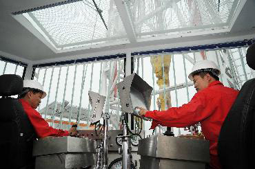宏華公司的鉆機(jī)操作員在調(diào)試交流變頻數(shù)控電驅(qū)動(dòng)鉆機(jī)(5月20日攝)。