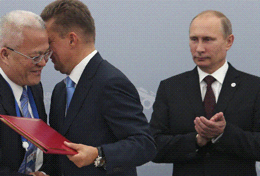 中石油董事長(zhǎng)周吉平(左)、俄羅斯天然氣股份公司管委會(huì)主席阿列克謝·米勒(中)、俄羅斯總統(tǒng)普京(右)