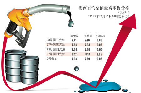 “雙12”來了,油價上漲的消息也再次傳來:昨日,國家發(fā)展改革委發(fā)出通知,決定將汽、柴油價格每噸均提高60元,測算到零售價格90號汽油和0號柴油(全國平均)每升分別提高0.04元和0.05元,調(diào)價執(zhí)行時間為12月12日24時。湖南各標(biāo)號汽油和柴油也隨之每升分別上漲0.05元、0.06 元。不過由于此次上漲幅度較小,對CPI走勢、物流企業(yè)和私家車油耗影響都不大。