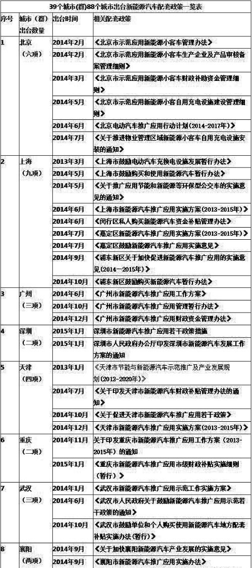 以下為39個(gè)城市(群)88個(gè)城市新能源汽車配套政策一覽表