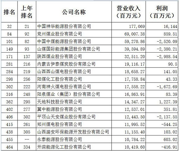 上榜2016財富中國500強(qiáng)的17家煤炭企業(yè)名單