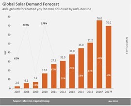 Mercom Capital Group(美國,德克薩斯州,奧斯汀)預測2016年全球太陽能光伏裝機量將達到76GW,并預計2017年太陽能光伏裝機量將為70GW。