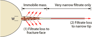 Because the DSF system arrests fracture growth through the development of an immobile mass, it is not essential to determine the precise width of the opening. Particles of any size become immobile when sufficient carrier fluid is lost. However, in situations where the primary mechanism for fluid loss is extrusion of the water to the tip, it is still assumed that particle drag along the tapered geometry of the short fracture is desirable. Consequently, the DSF design process includes the calculation of the theoretical width and selection of LCM with a particle size distribution that fits just within the fracture. The objective is not to plug the opening, so ideally 80% of the particles will be selected to fit within the design width.