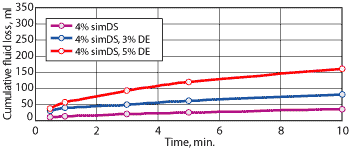 Lab tests have shown small percentages of diatomaceous earth to enhance the fluid loss. Diatoms are microscopic skeletal remains that are irregular in shape and exhibit poor packing efficiency. Figure 5 shows the effect of various concentrations of diatomaceous earth added to a DSF system. Relatively low concentrations appear to be sufficient to disrupt the packing efficiency of the other solids.