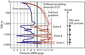Fig. 7 . ECD exceeded integrity by 1 to 3 ppg in three zones. Prevention of losses allowed two casing strings to be eliminated.