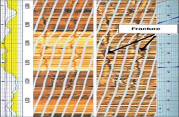 Fig. 8 . A short section of fracture identification log run on one well shows fracture initiated by borehole pressure exceeding integrity. Fractures were observed in 400 ft of the 700-ft pay zone.