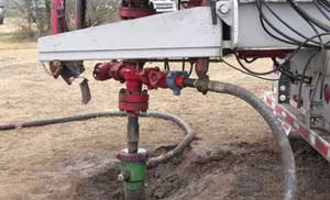 The proprietary deflection shoe was set on the end of the 27⁄8-in. production tubing string and hung at the deeper zone open hole at approximately 2,750 ft (839 m). The jetting technique involved running a pressurized cutting fluid through the CT string into the braided stainless steel flexible CT hose while circulating fluid between the CT and the production tubing to aspirate the cuttings generated from the AFJ process. The company has deliberately constrained the lateral reach of the flexible hose to 90 ft (27 m) to avoid the additional Texas permitting requirements when drilling horizontally longer than 100 ft (31 m), a requirement which is usually applied to conventional horizontal drilling.