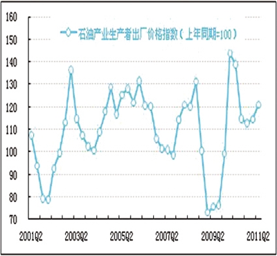 2011年二季度,石油產(chǎn)業(yè)生產(chǎn)者出廠價(jià)格同比上漲20.9%,漲幅較上季度擴(kuò)大6.4個(gè)百分點(diǎn)。