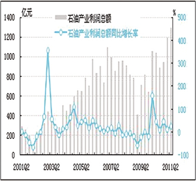 經(jīng)初步季節(jié)調(diào)整,2011年二季度石油產(chǎn)業(yè)利潤總額為1300.5億元,同比上升25.2%,同比增速較上季度加快12.9個(gè)百分點(diǎn);環(huán)比增長9.1%,增幅較上季度收窄16.8個(gè)百分點(diǎn)。