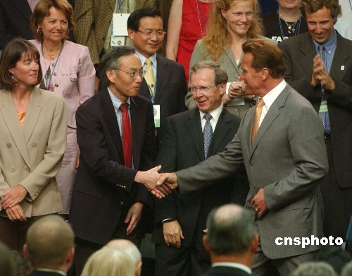 六月一日,美國(guó)加州州長(zhǎng)施瓦辛格出席舊金山市為聯(lián)合國(guó)世界環(huán)境日舉辦的《加州的未來(lái)》演講會(huì),與著名美籍華人科學(xué)家朱棣文握手問(wèn)好。
