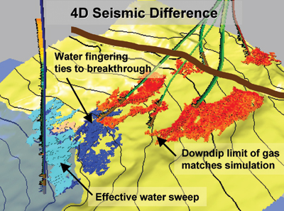 Gas released from solution as the reservoir pressure declines illuminates connected volumes of a reservoir in the 4-D data at Kizomba A. The data also show effective water sweep in one reservoir interval and fingering in another zone