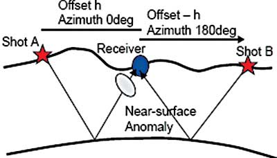 Schematic diagram of rays that have the same receiver and the same offset but a 180º difference in acquisition azimuth. Consequently, the recorded wavefields from the shots have experienced different near-surface effects.