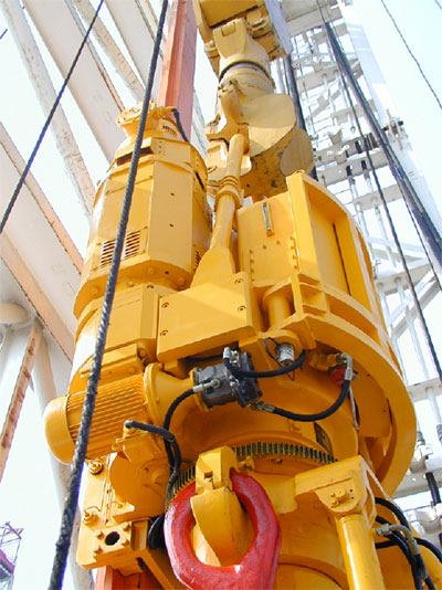 頂部驅(qū)動(dòng)鉆井裝置是集機(jī)、電、液于一體,結(jié)構(gòu)復(fù)雜,多學(xué)科交叉,用于取代傳統(tǒng)鉆井設(shè)備的新型裝置。公司研制的DQ-40J交流變頻頂部驅(qū)動(dòng)鉆井裝置代表著石油鉆井裝備的最新水平,采用五項(xiàng)自主專(zhuān)利技術(shù),通過(guò)中國(guó)石油天然氣集團(tuán)公司投產(chǎn)鑒定,已投入到鉆井工程應(yīng)用。