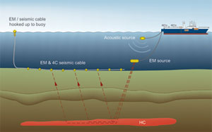While conventional seismic methods offer the best means to map the subsurface structural geometry, EM waves often identify reservoir fluids better than seismic compressional (P) waves. EM data acquired in combination with seafloor seismic (P and shear waves) are considered the best way of determining hydrocarbon probability.