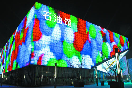 石油館的建筑外形為規(guī)則的長(zhǎng)方體和不規(guī)則的LED高清顯示結(jié)構(gòu)結(jié)合體,外表裝飾為象征著輸油管道的管狀編織圖案,具有鮮明的石油石化行業(yè)特色。