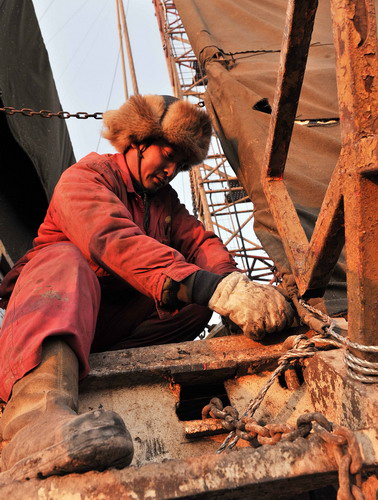 ①鉆井平臺圍上了阻擋寒風的帆布,員工操作不再冷。哪怕開了一個小口,員工也會及時捆綁結(jié)實。 ...