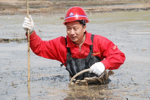 焊接機(jī)組電焊班長周平涉水測(cè)量河道。 |