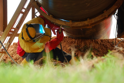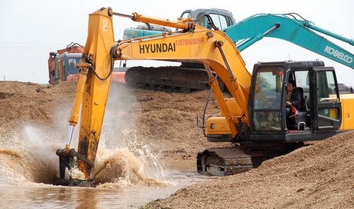 在河流大開挖施工中,管道三公司選派3個(gè)土方機(jī)組進(jìn)行河道圍堰、開挖和倒土修路,當(dāng)日僅土方機(jī)組就投入10臺(tái)挖掘機(jī)、50輛卡車和兩輛推土機(jī),總共動(dòng)用大型設(shè)備和車輛69臺(tái)套。