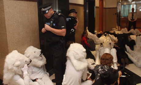 圖為綠色組織成員扮成北極熊,圍堵在凱恩能源的愛丁堡辦公樓內(nèi)