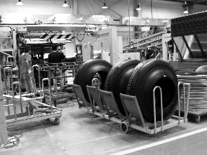 今年以來,陜西延長石油集團(tuán)橡膠有限公司克服原料天然膠價格大幅波動、輪胎市場因汽車工業(yè)增速放緩需求量銳減等不利影響,精心組織生產(chǎn),擇機采購原料,確保了滿負(fù)荷生產(chǎn)和企業(yè)效益最大化。1~7月,該公司共生產(chǎn)全鋼子午線輪胎25萬條,取得了較好的經(jīng)濟效益。圖為該公司員工將剛下線的輪胎送往倉庫。