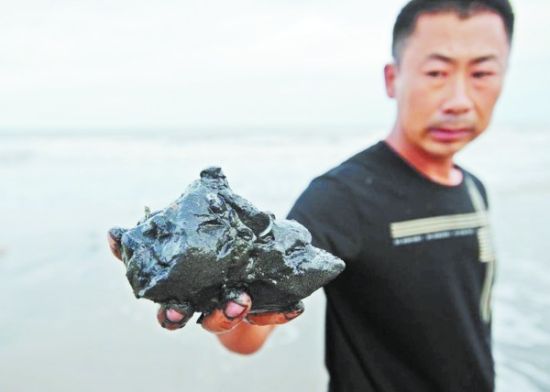 9月3日,樂亭養(yǎng)殖戶手舉疑為溢油所形成的黑色凝結(jié)物。