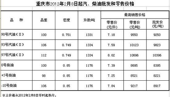 0號(hào)柴油(標(biāo)準(zhǔn)品)最高零售價(jià)格每噸提高300元,即由每噸8395元調(diào)整為8695元。調(diào)整后,我市93號(hào)汽油由之前的每升7.35元上漲到7.59元,上漲了0.24元/升。97號(hào)汽油則每升上漲到8.02元。