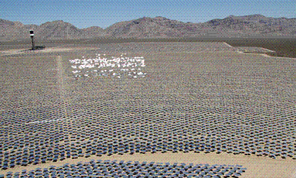 站在艾文帕發(fā)電廠130多米高的混凝土塔頂部,整個項目的全景一覽無余,20萬塊太陽能鏡面在塵土飛揚的山谷中閃閃發(fā)亮。每塊鏡面都有車庫門大小,安裝于支架之上,將太陽光定向集聚于中心的高塔。所有的鏡面匯集起來可以產(chǎn)生一千多度的高溫,這些熱量用于加熱高塔頂部的巨型鍋爐,將水轉(zhuǎn)化為蒸汽,進而推動渦輪機發(fā)電。