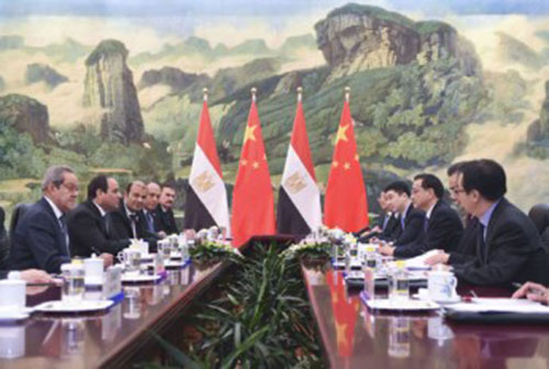 李克強(qiáng)指出,中方提出的“一帶一路”倡議同埃及正在規(guī)劃的國家發(fā)展戰(zhàn)略十分契合。希望雙方發(fā)揮互補(bǔ)優(yōu)勢(shì)開展產(chǎn)能合作,促進(jìn)經(jīng)濟(jì)發(fā)展和增加就業(yè)。加強(qiáng)基礎(chǔ)設(shè)施建設(shè)、貿(mào)易投資、高科技等合作,發(fā)掘新的合作增長點(diǎn)。中方愿積極參與埃及高鐵、鐵路、海底隧道、核電站等大項(xiàng)目建設(shè),推進(jìn)蘇伊士經(jīng)貿(mào)合作區(qū)建設(shè)。進(jìn)一步密切人文交流,夯實(shí)中埃友好的民意基礎(chǔ)。塞西表示,埃中傳統(tǒng)友誼深厚,兩國關(guān)系長期穩(wěn)定發(fā)展,合作前景廣闊。