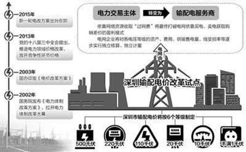 2015年1月,深圳啟動輸配電價改革試點,全國電力市場化改革又邁出重要一步。隨著輸配電價改革的推進,我國將逐步推進銷售電價市場化改革,逐步增加電力用戶選擇權,同時將一次能源價格變化信號及時傳導至銷售電價,使價格信號合理反映市場供求、資源稀缺和環(huán)境損害成本——2015年1月1日,深圳市如期啟動輸配電價改革試點,將現(xiàn)行電網(wǎng)企業(yè)依靠購、售電獲取差價的盈利模式,改為對電網(wǎng)企業(yè)按有效資產(chǎn)實行總收入監(jiān)管,公布獨立的輸配電價。