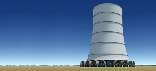 該公司設計的“下降氣流塔”(DowndraftTower)非常簡單,首先在炎熱、干燥的地方建造一個矩形空心圓柱塔,高度超過2200英尺,直徑超過1200英尺。(大約比全球最高的迪拜哈利法塔低了500英尺。)然后將水抽到頂部,向里噴入霧氣。這些霧氣會冷卻上升的熱氣流,加大重量后使之在塔內(nèi)向下流動,從而創(chuàng)造出時速50英里的人造風,推動安裝在塔底的渦輪轉(zhuǎn)動。