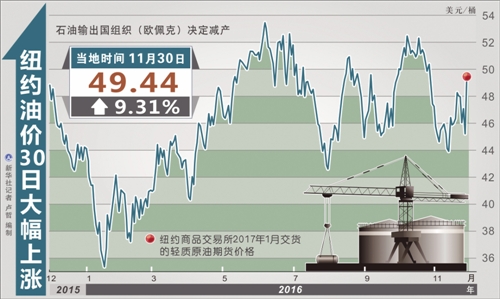 受歐佩克減產(chǎn)協(xié)議提振,國際原油市場出現(xiàn)了強勁反彈。截至當天收盤,紐約商品交易所2017年1月交貨的輕質(zhì)原油期貨價格上漲4.21美元,收于每桶49.44美元,漲幅為9.31%。2017年1月交貨的倫敦布倫特原油期貨價格上漲4.09美元,收于每桶50.47美元,漲幅為8.82%。分析人士認為,歐佩克減產(chǎn)的重要意義,除了實際減少產(chǎn)量之外,更重要的是歐佩克為國際原油市場明確了未來一段時間的走勢。
