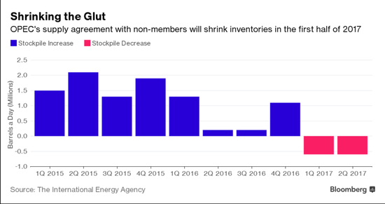 隨著石油輸出國(guó)組織(OPEC)和其他產(chǎn)油國(guó)實(shí)施減產(chǎn)協(xié)議,全球石油市場(chǎng)將在明年上半年從供應(yīng)過(guò)剩陷入供應(yīng)不足。